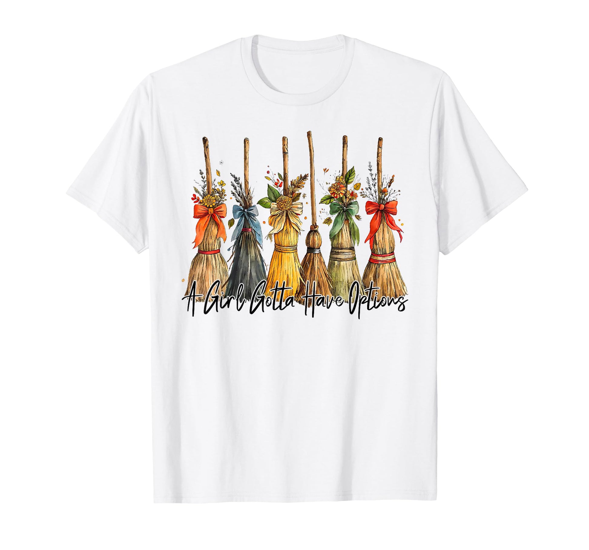 A Girl Gotta Have Options Halloween Witches Bow Floral Broom T-Shirt
