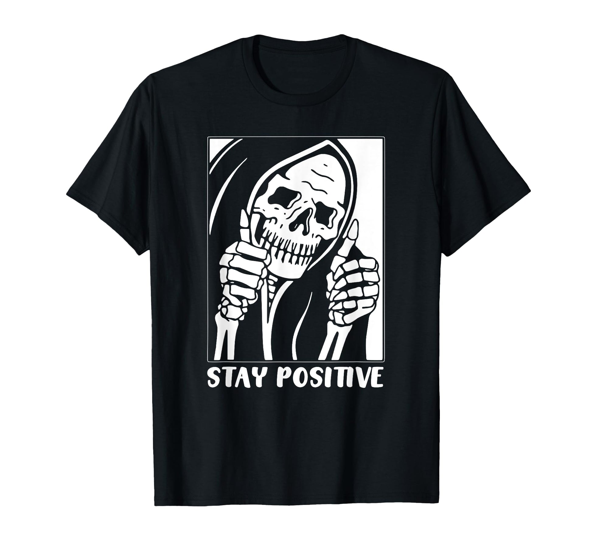 Death Stay Positive Skeleton Thumbs Up. White Unisex Graphic T-Shirt