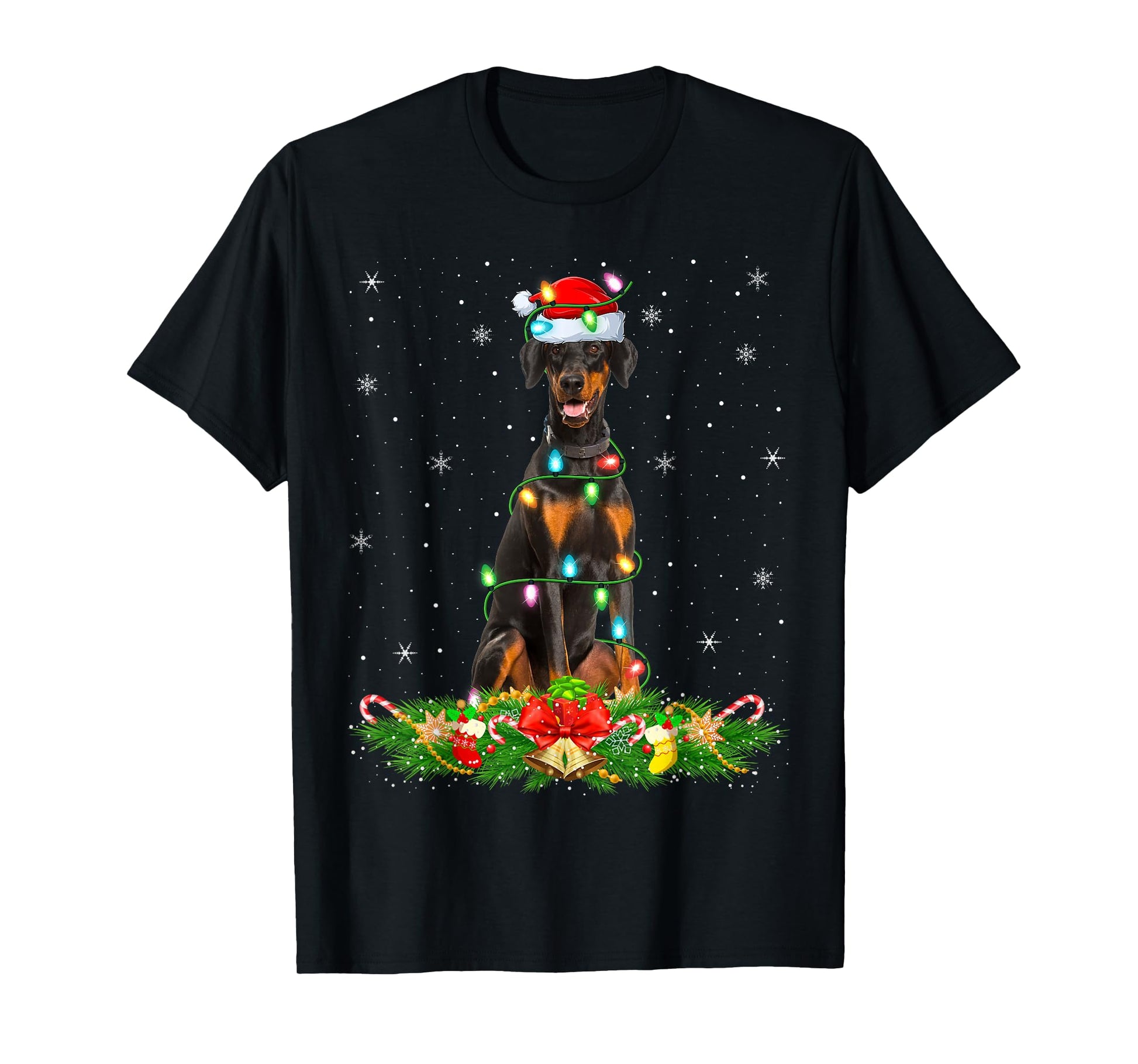 Dobermann Dog Christmas Lights Funny Santa Hat Xmas T-Shirt