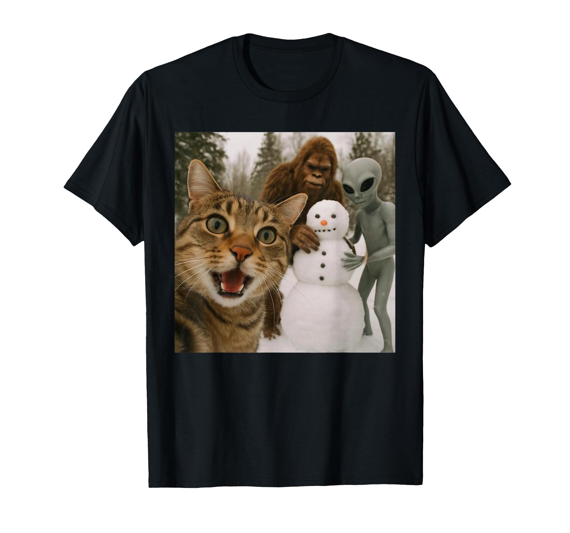 Funny Christmas Cat Selfie with Bigfoot Alien & Snowman T-Shirt