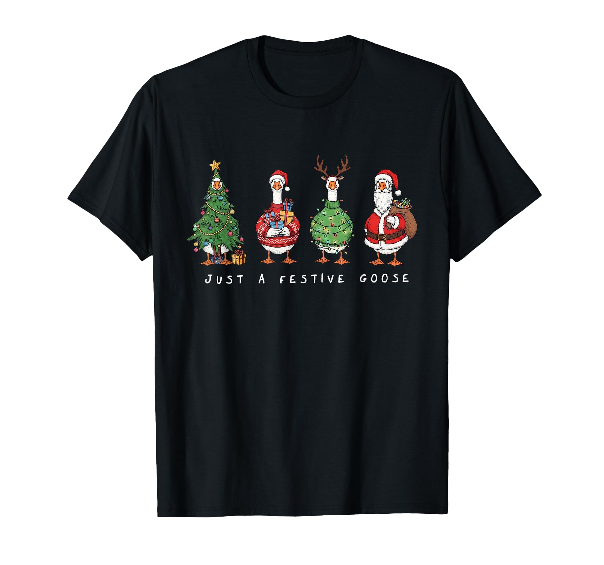 Funny Just A Festive Goose Santa Reindeers Merry Xmas Tree T-Shirt